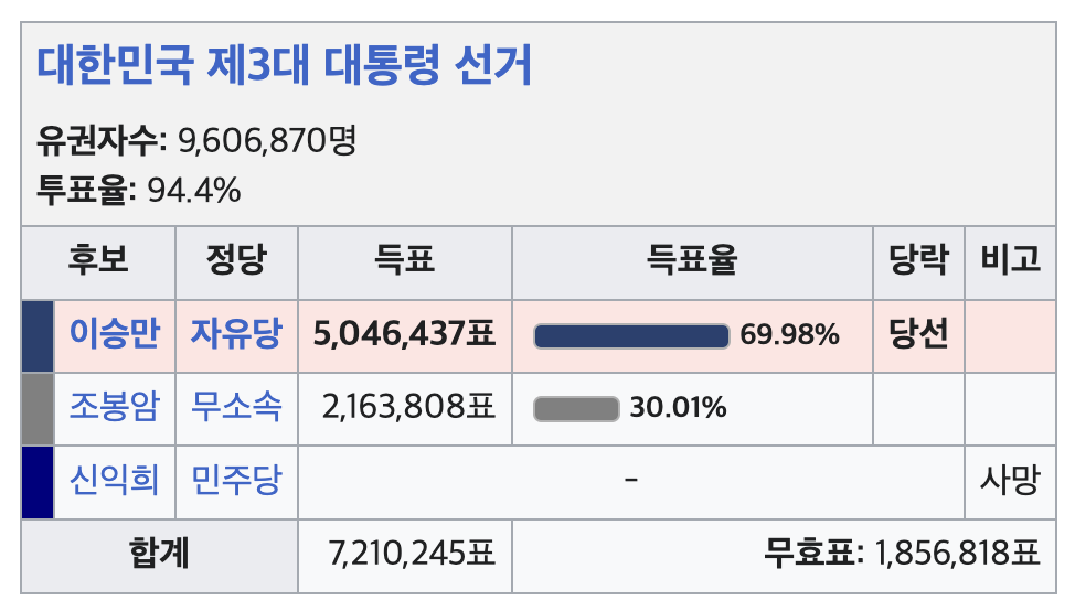 부통령에는 자유당이 아닌 민주당의 인물이 선출되었죠. 이렇게 대통령과 부통령이 서로 반대되는 당에서 선출된 것은 이때가 처음이었어요. 민심이 균열되고 있다는 것을 나타내는 신호라고도 볼 수 있죠. (아래 부통령 선거는 왜 제4대로 나와있냐면, 1대 대통령일 때 부통령을 두 번 뽑았기 때문이죠! 그래서 2대 대선과 3대 부선이 같이, 3대 대선과 4대 부선이 같이 시행됐어요.)