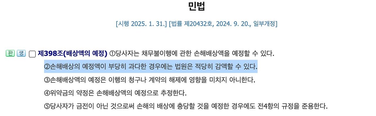그럼 계약은 계약이니까 벌금이 5천만 원이라도 내야 할까요? 물론 아니겠죠! 😚 민법 제398조(배상액의 예정)은 이에 대해 다루고 있어요. 배상액의 예정이란 실제로 손해가 얼마나 발생했는지를 따지지 않고 미리 손해배상액을 정해 놓는 것을 뜻해요. 손해가 발생할 때마다 일일이 대응하기보다는 금액을 정해두면 일 처리가 빨라지기 때문이죠.