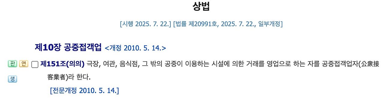 답은 "주인은 책임을 져야 한다!" 입니다. 왜냐구요? 이것은 상법에 똑똑히 명시되어 있기 때문이에요. 상법의 제2편 상행위 - 제10장 공중접객업을 보면 제151조(의의)에 공중접객업자에 대한 설명이 나오고