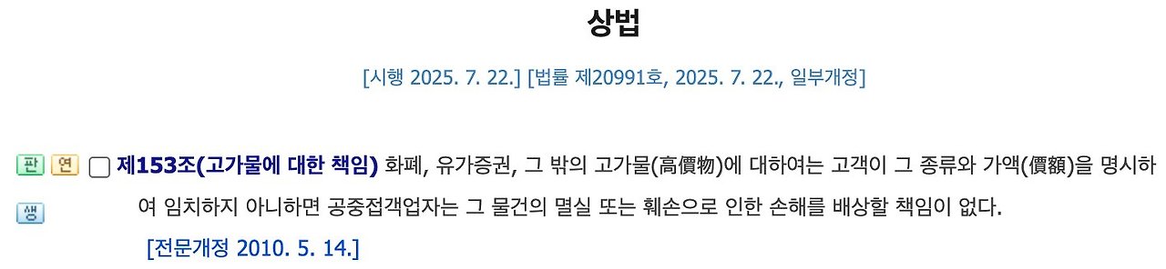다만 고객의 모든 물품 분실에 관해 책임을 져야 하는 것은 아니에요. 바로 "🛍️ 비싼 물건"이라면 말이죠. 이 역시 바로 다음 제153조에 나와요. (세트로 주루룩 있네요.) 특히 사우나에 가면 안내 문구로 많이 봤을 거예요.