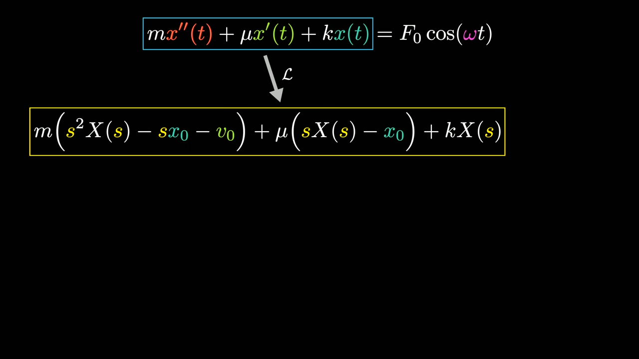 댐핑이 있는 용수철의 움직임은 첫 번째 줄과 같이 쓸 수 있다. 그걸 라플라스 변환을 하면 두 번째 줄로 나온다.